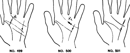 Cross-bars cutting the Mercury line (504) indicate illnesses at the age at which they are seen. These bars will vary from the finest little lines which seem to run over the top of the Mercury line and only fret it, to deep bars which cut the line in two.